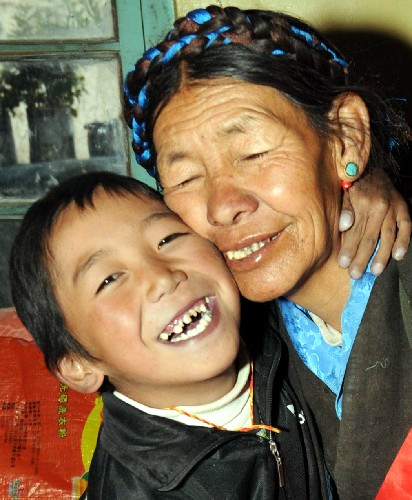 資料圖片:這是7歲的藏族兒童歐珠幸福地依偎在奶奶身邊(2008年10月17日攝)。 新華社記者 唐召明 攝