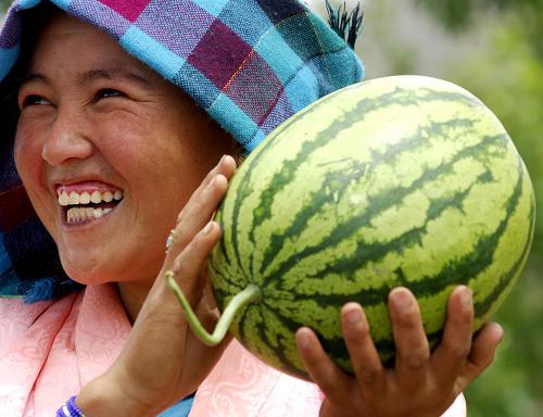 資料圖片:西藏日喀則農民喜收西瓜(2007年6月15日攝)。3月2日,國務院新聞辦公室發表的《西藏民主改革50年》白皮書指出,50年滄桑巨變,西藏經歷了從黑暗走向光明、從落后走向進步、從貧窮走向富裕、從專制走向民主、從封閉走向開放的光輝歷程。當前,西藏經濟發展、社會進步、文化繁榮、民生改善、民族團結、政通人和,正處于歷史上最好的發展時期。 新華社記者 普布扎西 攝