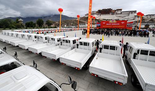 6月29日,為西藏行政村配備的農用運輸車停放在布達拉宮廣場。當日,黨中央、國務院為“西藏百萬農奴解放紀念日”向西藏農牧民群眾贈送物資儀式在拉薩舉行。黨中央、國務院在西藏慶祝“西藏百萬農奴解放紀念日”之際,下撥5.3億多元專項經費,專門用于為西藏行政村配備農用運輸車,實施西藏無電地區應急照明工程,給有電地區群眾配備廣播電視接收器,給“三老”人員發放慰問金和頒發紀念證書,對生活困難群眾發放補貼經費。新華社記者覺果攝