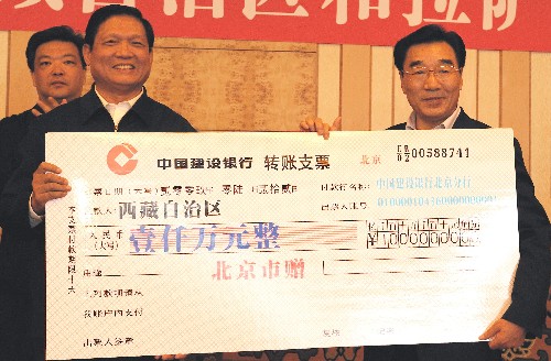 資料圖片:6月26日,中共中央政治局委員、北京市委書記劉淇(前左)與西藏自治區黨委書記張慶黎交接北京市贈給西藏自治區的1000萬元支票。新華社記者 格桑達瓦 攝