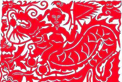 黔東南苗族民間剪紙的獨特之處,首先表現在它的題材上,有許多與創世紀和人類起源有關的神話傳說。如人頭蝶身的剪紙圖案,就是苗族古歌中的“蝴蝶媽媽”。傳說蝴蝶媽媽是由楓樹變的,因和水上的泡沫“游方”(戀愛)懷孕后生下12個蛋。經鶴字鳥替她孵了12年,才生出第一個姜央和雷公,以及龍、虎、蛇、象、水牛、娛蟻等12個兄弟,從此天下便有了人和動物。苗族民間剪紙圖案中還有“桑扎射日”的神話,說的是古時候有“日月十二雙,日夜不停跑;曬得田水啊,好比開水冒;曬得石頭啊,軟得像粘糕;曬得坡上啊,草木齊枯焦。”為此,苗族先祖造了一把巨大的弓,請一位叫桑扎的英雄去射日月。當桑扎射掉11對日月以后,剩下的一對日月被嚇得藏起來了,天地變得黑茫茫一片,人們無法外出做活路。后來,先祖們請來公雞,“公雞拍拍翅,抬頭高聲喊;早晨哩哩叫,太陽出東方,下午哩哩叫,月亮接著上”。此后,萬物得到生長,人類才得到安寧。從蝴蝶媽媽生人類及一切動物到兄妹合磨成親、桑扎射日月、女人馴龍牛、女人馴象等剪紙圖案看,既是對母系社會遺風的追溯,又是反映遠古時代人類常與各種野獸和嚴重旱災進行生死斗爭的形象記錄。另外,原始的巫術禮儀作為苗族生活的重要內容,在剪紙中也有較多的反映。苗族是多神論者,崇拜自然物,崇拜祖先,崇拜生命。他們認為人的禍福是由神鬼掌握的,要得福免災就必須求神的護佑。巫師是溝通人與神的媒介,由他來祭神驅鬼。因此,苗族人對巫師非常虔誠尊重。剪紙中的巫師形象莊嚴肅穆,身佩執法的長劍,舉著裝有降伏惡鬼法力的葫蘆,顯得神秘莫測。這些古拙簡樸、粗獷豪放、富有神話和宗教色彩的剪紙圖案,充分展示了苗族的獨特氣質和久遠的歷史。