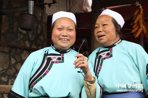 兩位大娘娘為到訪的記者們獻上山歌(中國臺灣網 楊永青 攝)