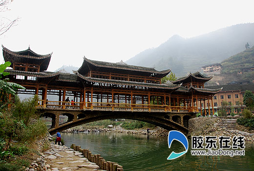 苗寨果然是名不虛傳,領(lǐng)教了姑娘們的熱情,第二天一早昨夜籠在夜色里的苗寨已全然在記者們的視線之內(nèi)。放眼望去,整個(gè)苗寨依山而建,吊腳樓層層疊疊,順著山勢向上爬,直至第一梯度的山頂。整個(gè)苗寨建在兩山之間,一條靜靜流淌著的白水河穿寨而過,將苗寨一分為二,幾座風(fēng)雨橋悠閑地倚在河上。河水碧綠,這在沿海省份是不多見的。在導(dǎo)游的帶領(lǐng)下,大家沿著山腳的臺(tái)階拾級(jí)而上,穿行于吊腳樓之間。據(jù)了解,現(xiàn)在不少這樣的居民吊腳樓都已得到開發(fā),可提供旅游住宿,讓游客最真實(shí)地體驗(yàn)苗家生活。當(dāng)?shù)仉S行的宣傳部門的領(lǐng)導(dǎo)介紹說,吊腳樓是木建筑結(jié)構(gòu)的,建設(shè)非常不易,每座樓的建設(shè)純粹依山取勢,要在狹小的空間里獲得最大限度的生存和居住空間,所以吊腳樓一般都是有一部分是懸空的。看起來雖然危險(xiǎn),但是卻非常的結(jié)實(shí)。這讓我們非常嘆服苗家人那種征服大山的勇氣,也正是這種勇氣,再加上苗人的智慧,使得他們的祖先雖然幾經(jīng)遷徙,卻仍然保持了獨(dú)特的苗人文化,堅(jiān)強(qiáng)不息地代代生存?zhèn)鞒辛讼聛怼T谏巾數(shù)挠^景臺(tái),俯瞰整個(gè)苗寨,才明白了余秋雨那句話的份量:……生生死死爭著往前走,終于走到的一個(gè)美麗的終點(diǎn)。這里可以說是一個(gè)世外桃源,我們在來的時(shí)候,是經(jīng)歷了近一個(gè)小時(shí)的車程,在荒無人煙的大山小道上幾經(jīng)曲折才來到這美麗的所在。