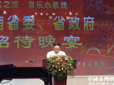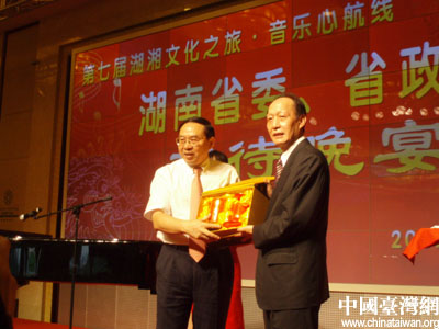梅克保在致辭中簡要介紹了湖南省的基本情況和經濟社會發展情況。梅克保說,湖南歷史悠久,文化底蘊深厚,是中華農耕文化的發源地之一。以心憂天下、敢為人先、經世致用為特點的湖湘文化為世人矚目,更影響和造就了一代又一代的杰出人才。湖南資源豐富,以“魚米之鄉”、“有色金屬之鄉”、“非金屬礦之鄉”著稱于世,湖南的旅游資源也十分豐富,山清水秀,名勝古跡甚多。同時,湖南也是一方改革開放的熱土,湖南原本是一個農業大省,當前正在加速推進新型工業化進程,經濟快速發展的同時,科技、教育、衛生等各項社會事業也獲得了全面的發展。相信來自寶島臺灣的師生們一定會為三湘四水的美麗風光所吸引,為絢麗多姿的湖湘文化所興奮,為情意綿綿的湘音湘曲所陶醉,兩地師生會以火一樣的激情、水一樣的深情譜寫出湘臺兩地情誼山高水長的動人華章。