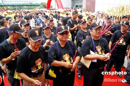 九月五日中午,臺灣鹿港天后宮進香團的三百多名媽祖信眾由金門分兩批乘船抵達泉州石井對臺客運碼頭,進行為期五天的謁祖進香活動。 這是鹿港天后宮開基媽祖一百九十一年后重回大陸謁祖。據(jù)介紹,鹿港天后宮媽祖,是三百多年前施瑯將軍從福建引請到臺灣的。曾于清嘉慶二十二年(一八一七年)在鹿港八郊人士護送回湄洲祖廟謁祖,迄今已一百九十一年,這次再回祖廟會香,見證兩岸媽祖神緣。圖為鹿港進香團在石井碼頭舉行祭拜儀式。 中新社發(fā) 傅丹丹 攝