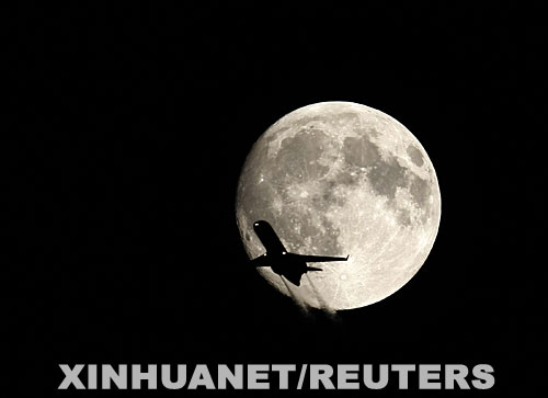 9月25日,在匈牙利首都布達佩斯,一架飛機從掛著滿月的空中飛過。 新華社/路透