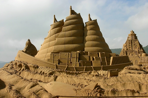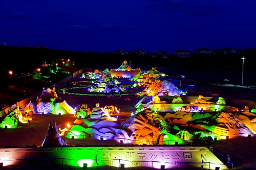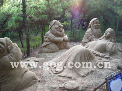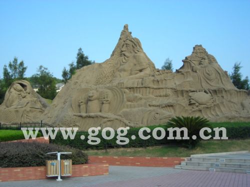 當天下午,“輝煌60年 全國網媒記者浙江行”采訪團來到位于舟山朱家尖海灘公園,參觀了該海灘公園。當記者們來到公園門前時,就被一副巨大的雕塑作品吸引了,走進一看才發現,原來這尊雕塑全部都是用沙子雕砌而成的。走進公園后發現,公園內通往海濱公園的道路兩旁,都是用海砂雕塑的作品:有小孩子喜歡的白雪公主和小矮人,有神秘莫測的埃及金字塔,還有英姿颯爽的運動健兒......總之,只要想得到的,這里都應有盡有,這便是被喻為將沙子變成金的沙雕藝術。