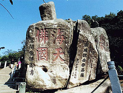 ■海天佛國(guó)石 海天佛國(guó)石位于香云路盡頭處,路側(cè)有一石大如屋,斜置若撲,上鐫"海天佛國(guó)"大字,今已成為普陀山之代稱。巖頂累一石,長(zhǎng)方形,如同一面風(fēng)帆,鐫"云扶石",崖間尚有"云海"、"別有一天"題刻,為普陀山摩崖石刻較為集中處。