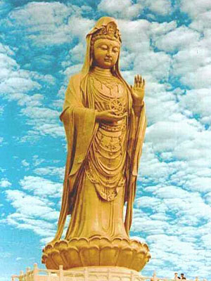 ■南海觀音大佛 南海觀音露天銅像位于普陀山之東南的龍灣崗巔。菩薩臉如滿月,眉目清秀,左手托法輪,右手結(jié)無畏印,顯現(xiàn)大慈大悲相,光耀天日,壯麗無比。像高33米,重70余噸,乃當(dāng)今觀音銅像之最,也是海天佛國(guó)的象征。佛像基層是面積1000多平方的功德廳,上層供奉500尊形態(tài)各異的觀音銅像,下層大廳飾有觀音靈異故事的大型黃楊木雕和以普陀山景色為題材的彩玉浮雕,精美絕侖。
