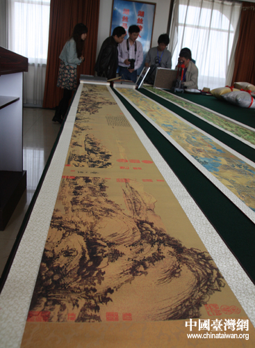中國臺灣網(wǎng)4月26日湖州消息 一幅名卷展世博,兩岸深情盼團(tuán)圓。25日,由人民網(wǎng)、中國臺灣網(wǎng)等23家網(wǎng)絡(luò)媒體組成的“全國知名網(wǎng)絡(luò)媒體浙江行”記者一行,走進(jìn)了為世博會(huì)研制永久陳列絲綢國寶的絲綢之路集團(tuán),在60多件獻(xiàn)禮世博會(huì)的絲綢精品中,兩卷合一的絲綢織錦畫長卷《富春山居圖》引人注目。