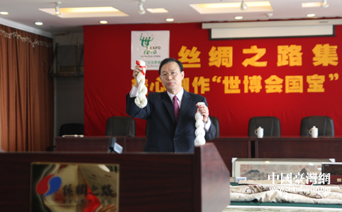絲綢之路集團董事長凌蘭芳介紹在倫敦首屆世博會獲得金牌的湖州輯里湖絲仿制件與現(xiàn)代工藝制作的湖絲(中國臺灣網(wǎng) 李典典攝)