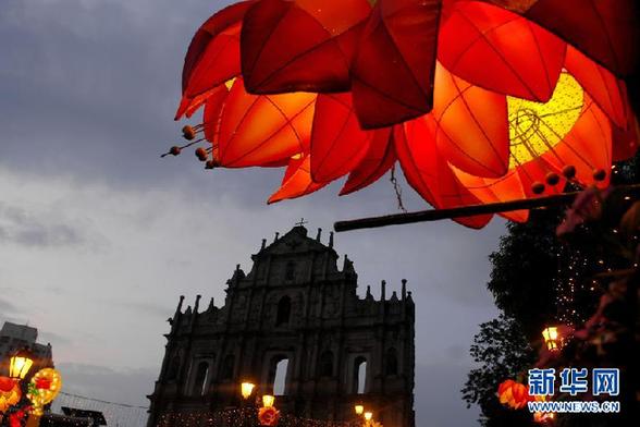 這是澳門大三巴牌坊前的燈飾(9月9日攝)。近日,澳門特區民政總署在澳門各知名旅游景點裝上富有中國特色的節日燈飾,營造了濃郁的中秋節氣氛。(新華社記者 張金加 攝)