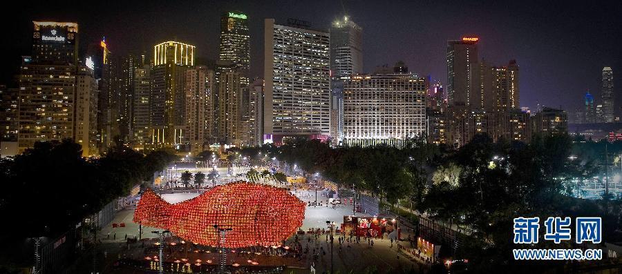 圖為在彩燈會中展示的巨型魚形花燈(9月5日攝)。中秋節(jié)將至,香港旅游發(fā)展局在維多利亞公園舉辦中秋彩燈會,展示各類彩燈供市民觀賞,其中包括一個以竹棚搭建并有望成為世界最大彩燈裝置的巨型魚形花燈。新華社記者呂小煒 攝
