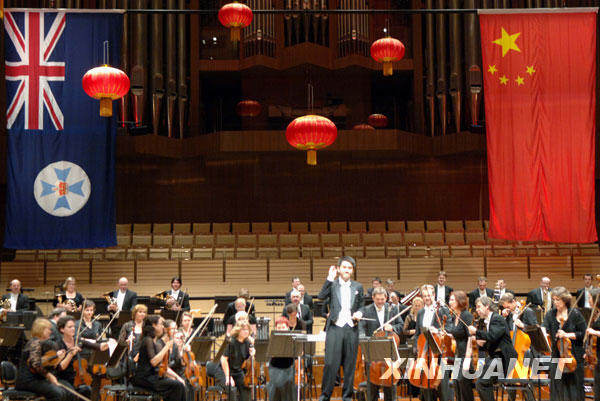 9月2日,在澳大利亞東部海濱城市布里斯班的昆士蘭州表演藝術中心音樂大廳,來自中國香港愛樂樂團的副指揮蘇柏軒與昆士蘭交響樂團演出后向觀眾致謝。當日,為慶祝中華人民共和國成立60周年和中國傳統佳節中秋節,以及昆士蘭建州150周年,由昆士蘭交響樂團和來自中國的年輕藝術家們在這里聯袂演出一場題為“東西合璧”的音樂會。 新華社記者江亞平攝