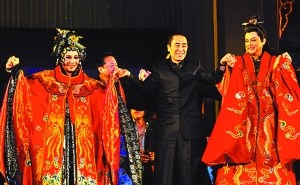 《圖蘭朵》演出結束之際,總導演張藝謀(中)攜主演莫華倫(右)、幺紅(左)等謝幕。林毅/攝