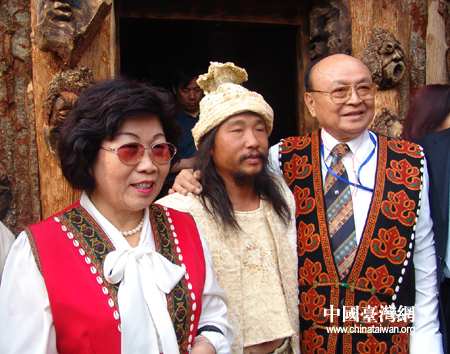 開幕式后參加第三屆海峽兩岸少數(shù)民族發(fā)展研討會的臺灣代表團(tuán)代表參觀云南民族村。圖為華先生夫婦與哈尼族穿樹皮衣的族人合影。(于曉亮)