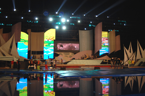 央視秋晚是近年來 “中華情”在日常歌會之外承辦的重要主題晚會。從2004年在上海浦江畔舉辦的“浦江月·中華情”到2005年在武漢黃鶴樓腳下舉辦的“江城月·中華情”,一直在戶外舉辦的秋晚日益形成了自己的藝術風格。景觀舞美便是這眾多藝術風格中最閃亮、最奪目的一點,也是2005年“江城月·中華情”獲得國際大獎的重要原因。不知大家是否還記得2004年浦江畔那艘蓄勢待發的帆船,以及2005年黃鶴樓腳下再現的瓊樓玉宇,秋晚的舞臺成為中華民族地緣文化符號的藝術再現,給全球華人留下了深刻印象。