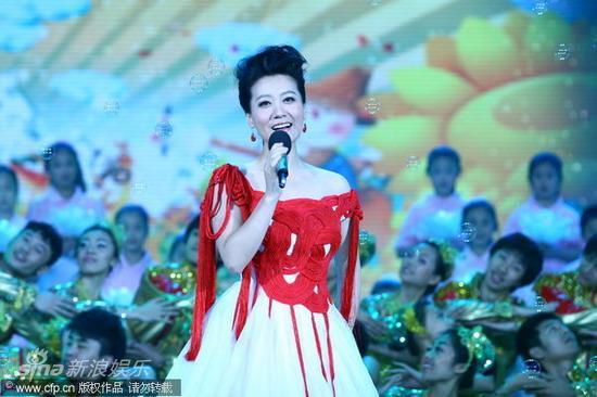 歌手譚晶則身穿紅色的中國結上衣搭配白裙登臺獻唱,身后則有一群舞者伴舞,和往年的歌唱節目頗為類似。圖為譚晶深情演唱。