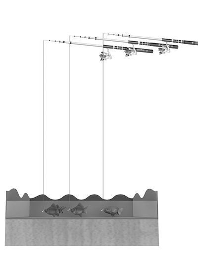 魔術師的助手在天花板上用魚線勾著魚餌誘魚。