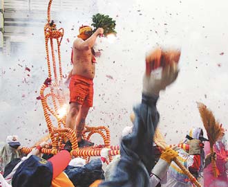 元宵炸寒單爺活動越夜越瘋狂,炮手拿著鞭炮往寒單爺神轎丟。 聯合報圖
