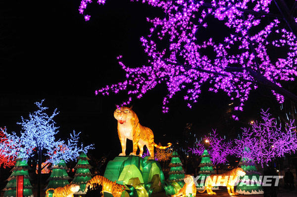 2月26日,西寧市區(qū)的“彩燈樹”與“虎園”相映成畫。 臨近元宵佳節(jié),西寧市各區(qū)、縣的彩燈展內(nèi)容豐富,造型各異。璀璨奪目的彩燈給高原古城帶來濃郁喜慶的節(jié)日氣氛。新華社記者侯德強(qiáng)攝