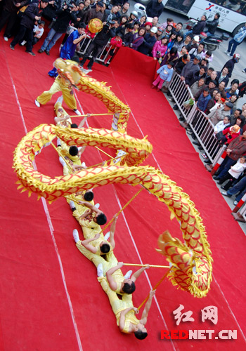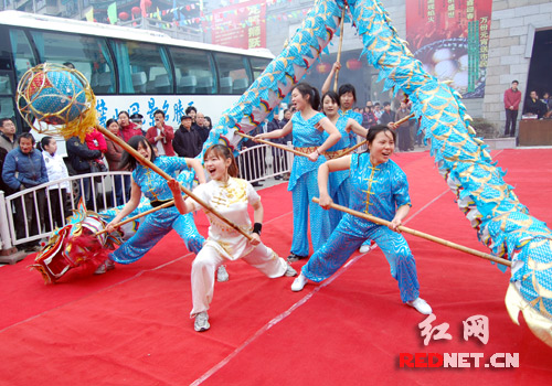 (為龍點睛) 紅網長沙2月9日(記者 喻向陽 通訊員 黃潔)星城長沙的元宵節氣氛越來越濃厚了,今天上午11時許,岳麓山東大門人山人海,大鼓敲起來,龍獅躍起來。岳麓山邀請的中國首屆大學生龍獅錦標賽冠軍--中南大學龍獅隊,在紅地毯上進行現代競技龍獅表演。